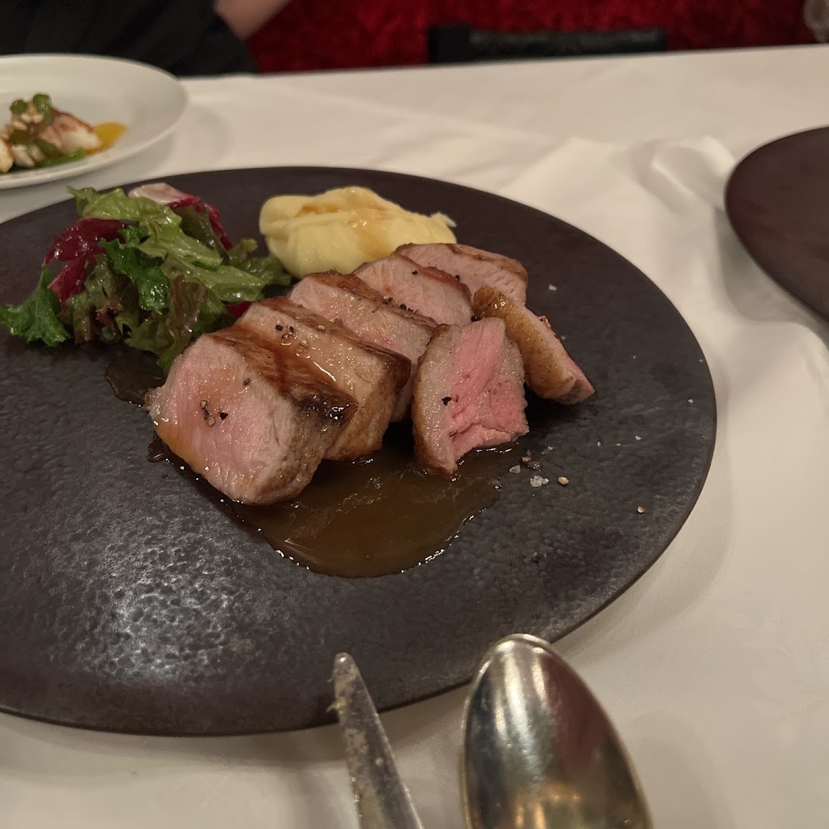 For a savory treat, the マッシュルームのフリット (Mushroom Fritters) are a must-try. These crispy, golden bites are bursting with rich, earthy flavors, making them the perfect start to any meal. Another favorite on the menu is the 仔羊背肉のロティ ソース シャスール (Roasted Lamb Rack with Chasseur Sauce), a tender and flavorful dish that showcases the depth of French cuisine. The lamb is perfectly cooked and served with a savory sauce that elevates its rich taste, making it a standout main course.